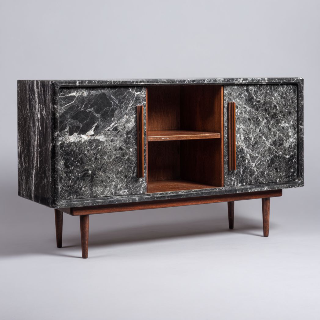 • Meuble TV en bois massif avec portes en marbre noir et étagères centrales
